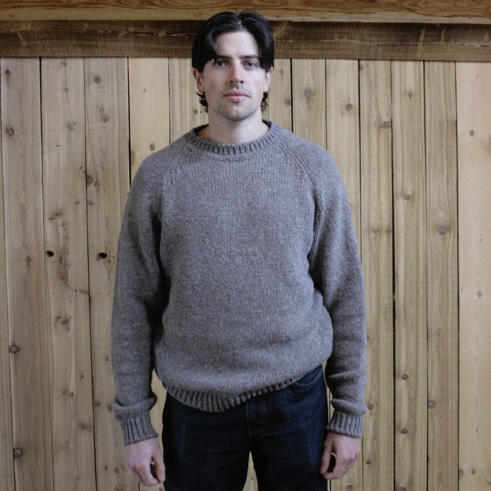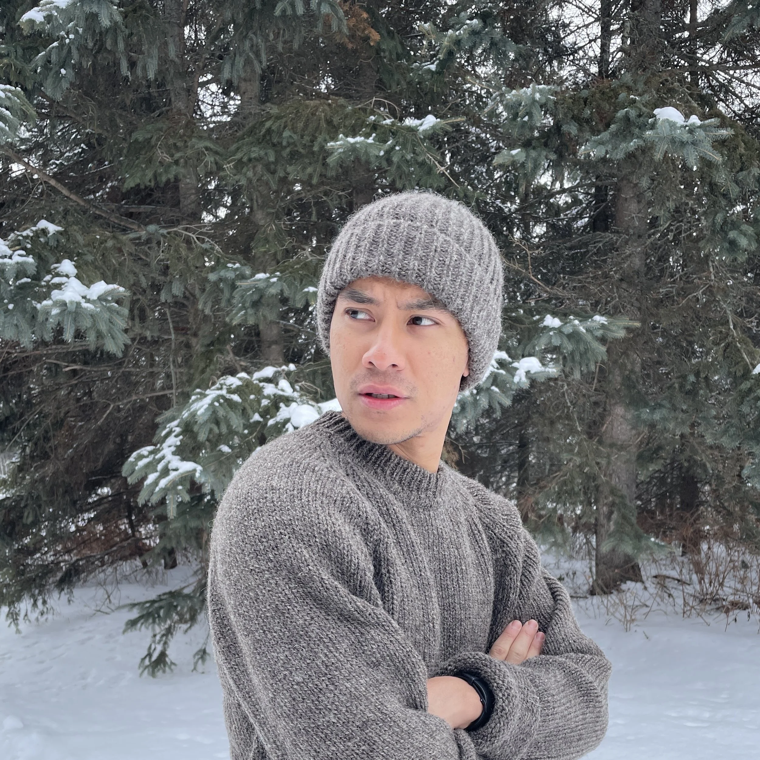 Every certified piece is crafted in my tiny home studio in rural Alberta using a flatbed manual knitting machine and finished by hand. I work exclusively with 100% undyed Canadian wool sourced from farms across the Prairies — wool that reflects the land it comes from.